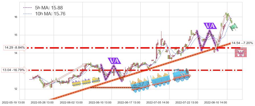 ♘ 支撑价格位14.29,可信任强度88.82%,距离最后交易2022-08-12 14:00形成的收盘价格15.67相差 -8.84%