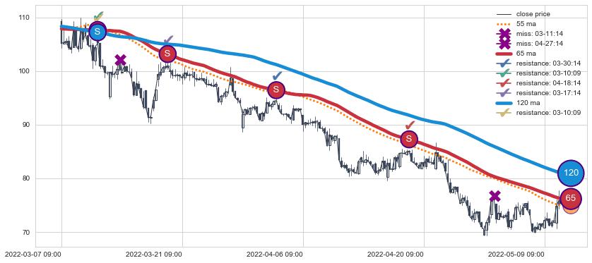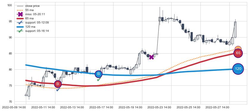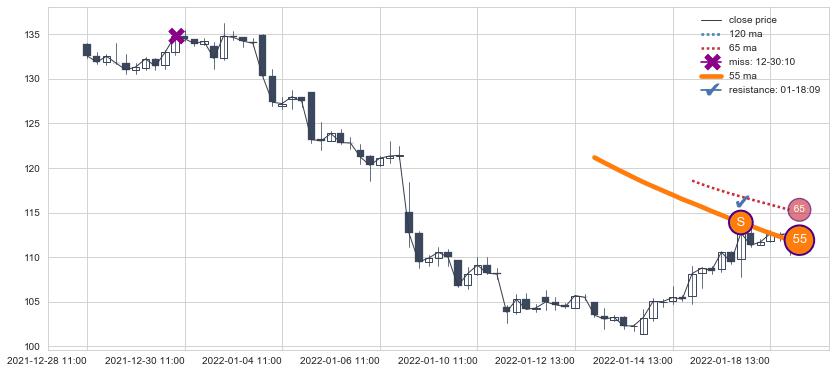 ⚀ 2022-07-08 14:00:00小时显现 60小时-90小时-120小时均线 【断头铡刀】卖出点 看空信号,后市看跌,卖出