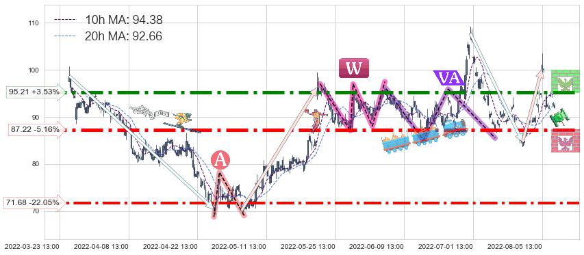♘ 阻力价格位95.21,可信任强度88.64%,距离最后交易2022-08-12 14:00形成的收盘价格91.96相差 +3.53%