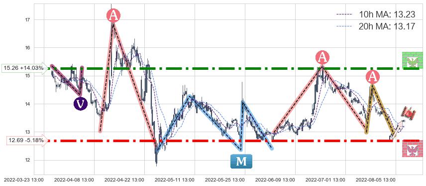 从2022-08-03 14:00至2022-08-12 14:00,共包含13个小时,阶段股价上涨4.78%,阶段股价变动位移路程比: 1 : 1.4