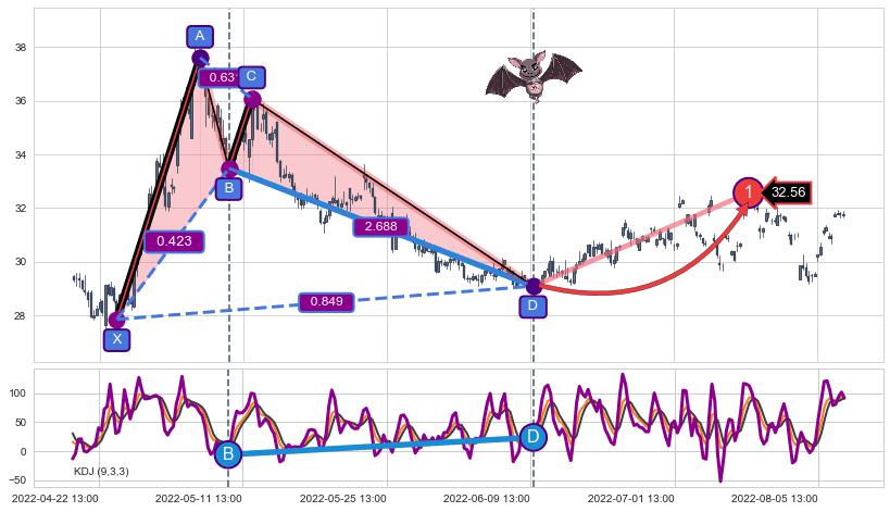 | 12 🅚:【金蜘蛛】买入点 ➕ 📡:谐波蝙蝠已到达d点:猜想c下行到达d点后报复性拉升上涨(均值回复) ☞ 看多信号 ⇥ 【均线】交织【图形】⇥ 综合量化分数: 55 | > |