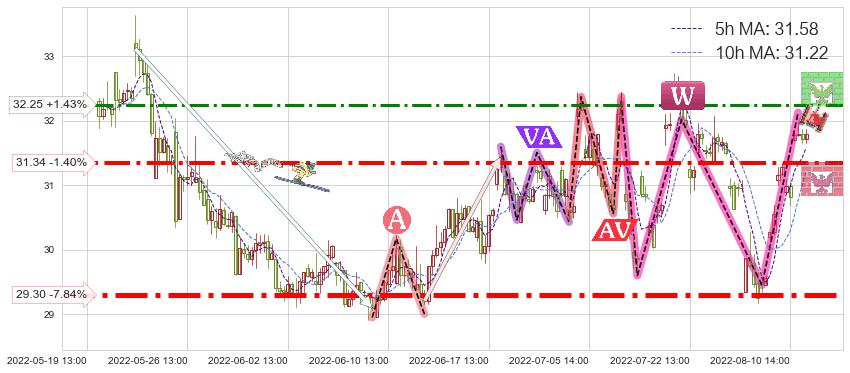 ♘ 阻力价格位32.25,可信任强度60.31%,距离最后交易2022-08-12 14:00形成的收盘价格31.79相差 +1.43%