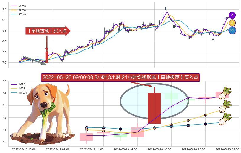 ⚀ 2022-05-20 09:00:00小时显现 3小时-8小时-21小时均线 【旱地拔葱】买入点 看多信号,后市看涨,买入