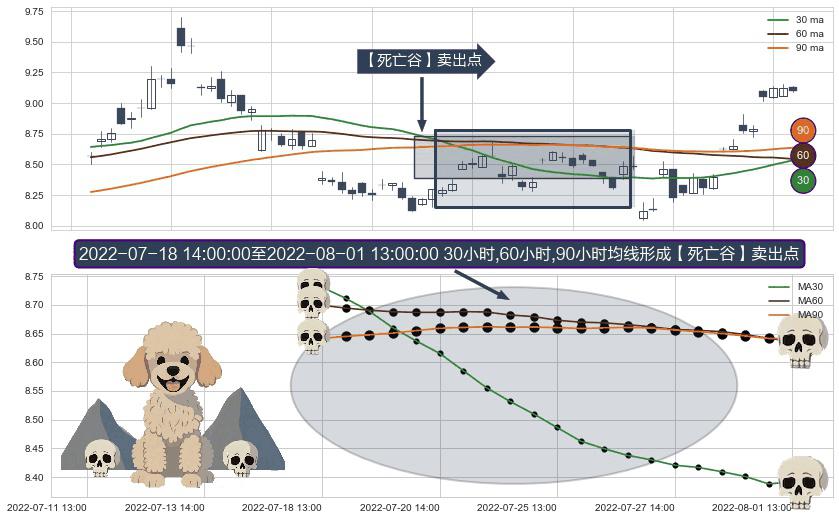 ⚀ 2022-07-19 13:00:00-小时至2022-08-01 13:00:00-小时显现 30小时-60小时-90小时均线 【死亡谷】卖出点 看空信号,后市看跌,卖出
