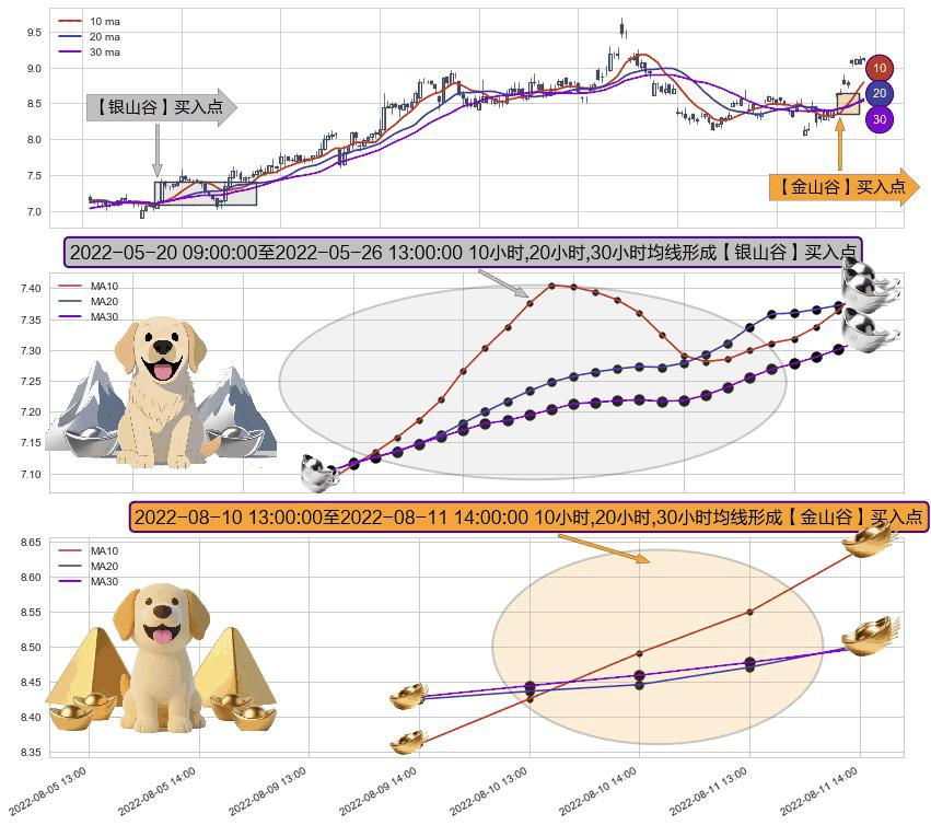 ⚄ 2022-08-10 14:00:00-小时至2022-08-11 14:00:00-小时显现 10小时-20小时-30小时均线 【金山谷】买入点 其再次确认了买入信号,可靠性更强,买入
