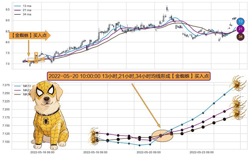 ⚀ 2022-05-20 10:00:00小时显现 13小时-21小时-34小时均线 【金蜘蛛】买入点 看多信号,后市看涨,买入