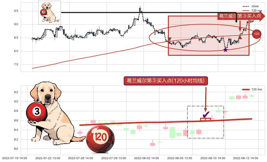 ⚀ 2022-08-09 13:00:00-小时显现 葛兰威尔均线 120小时均线 第③买入点 上升趋势的中继信号,后市看涨,买进信号