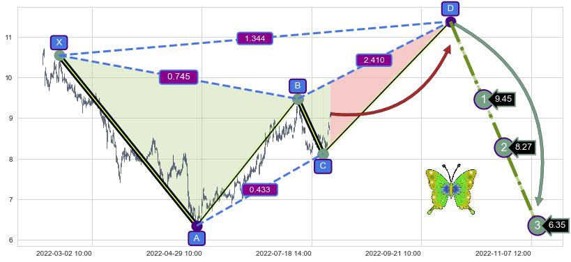 ➣ 未完成【蝴蝶】形态起点X: 02-14:10, 已到达C点: 08-02:13, 预测最终D点: 10-04:09, 共712交易小时