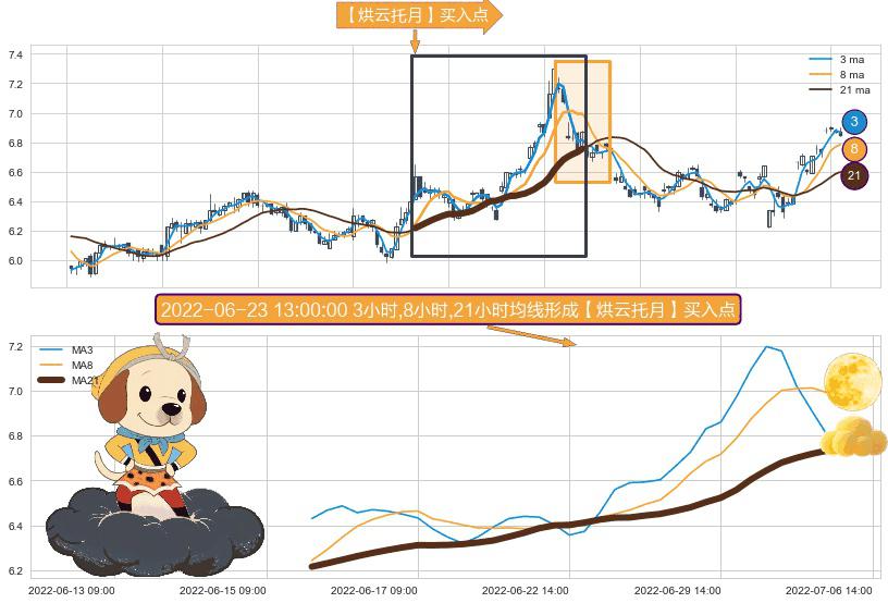 ⚀ 2022-06-15 13:00:00小时-2022-07-05 14:00:00小时显现 3小时-8小时-21小时均线 【烘云托月】买入点 看多信号,后市看涨,买入