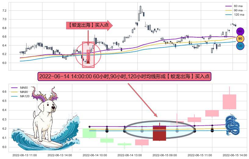 ⚀ 2022-06-14 14:00:00小时显现 60小时-90小时-120小时均线 【蛟龙出海】买入点 看多信号,后市看涨,买入