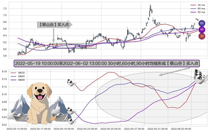 ⚀ 2022-05-19 11:00:00-小时至2022-06-02 13:00:00-小时显现 30小时-60小时-90小时均线 【银山谷】买入点 看多信号,后市看涨,买入