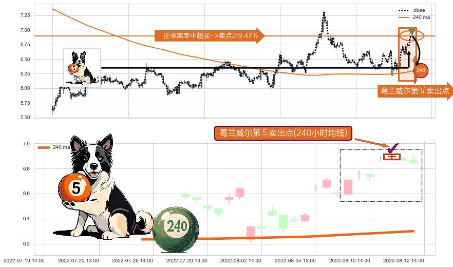 ⚀ 2022-08-11 14:00:00-小时显现 葛兰威尔均线 240小时均线 第⑤卖出点 上升趋势均值回复的短线回落信号,后市看跌,卖出信号