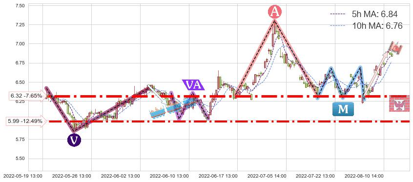 ♘ 支撑价格位6.32,可信任强度97.68%,距离最后交易2022-08-12 14:00形成的收盘价格6.84相差 -7.65%