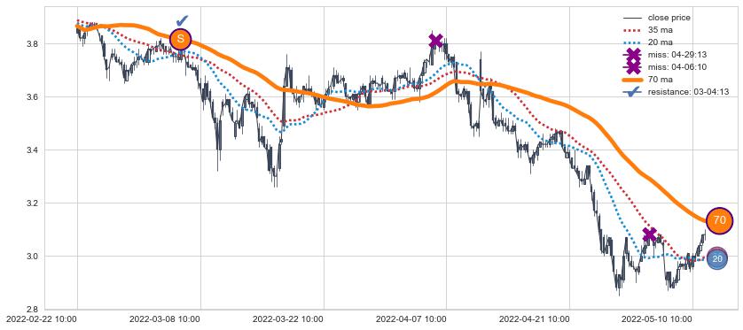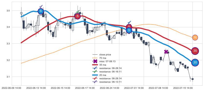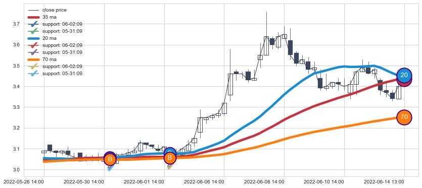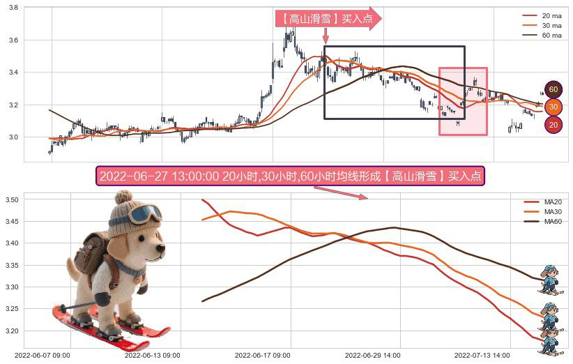 ⚀ 2022-06-13 14:00:00小时-2022-07-18 14:00:00小时显现 20小时-30小时-60小时均线 【高山滑雪】买入点 看多信号,后市看涨,买入