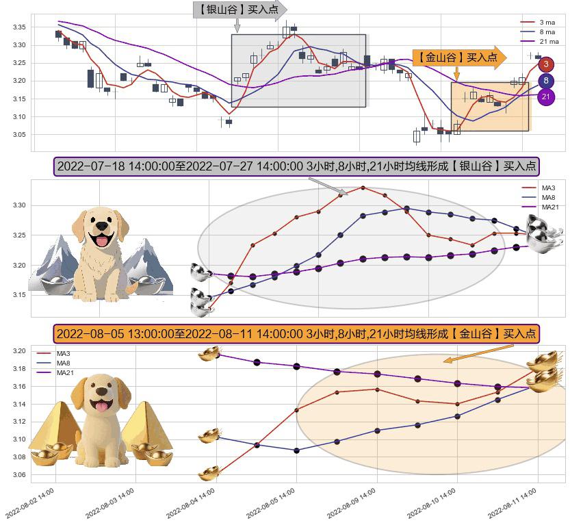 ⚄ 2022-08-05 14:00:00-小时至2022-08-11 14:00:00-小时显现 3小时-8小时-21小时均线 【金山谷】买入点 其再次确认了买入信号,可靠性更强,买入