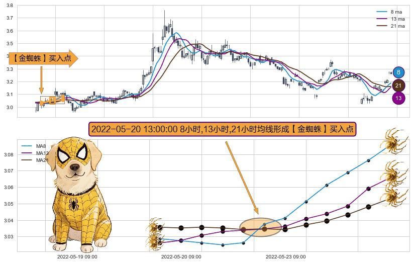 ⚀ 2022-05-20 13:00:00小时显现 8小时-13小时-21小时均线 【金蜘蛛】买入点 看多信号,后市看涨,买入