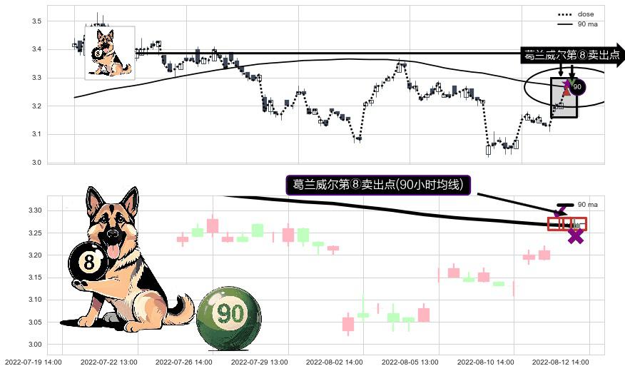 ⚀ 2022-08-12 14:00:00-小时显现 葛兰威尔均线 90小时均线 第⑧卖出点 下降趋势的中继信号,后市看跌,卖出信号