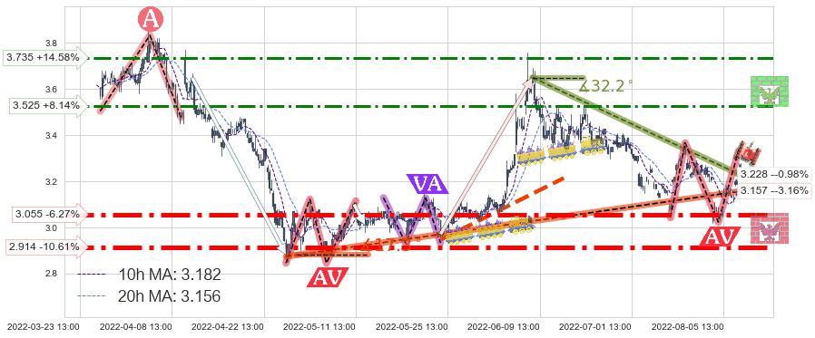 ♘ 阻力价格位3.525,可信任强度68.93%,距离最后交易2022-08-12 14:00形成的收盘价格3.260相差 +8.14%