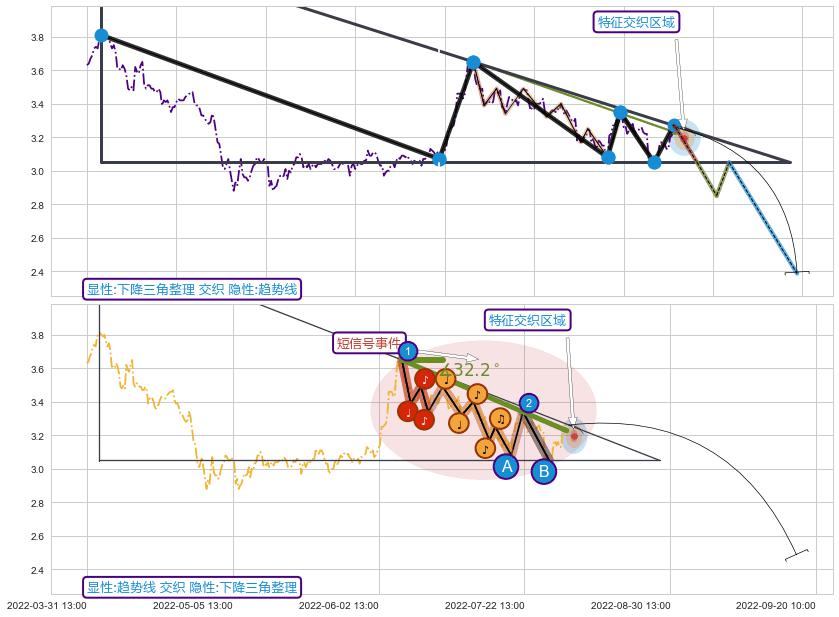 ♘ 在最后的下跌阶段2022-06-08 14:00至2022-08-11 14:00,存在 破位边缘的阻力位 ,阻力价格3.228,可信任强度73.79%,其距离最后价格3.260相差 -0.98%