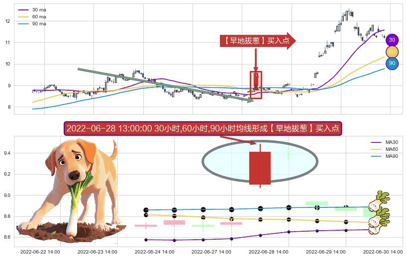 ⚀ 2022-06-28 13:00:00小时显现 30小时-60小时-90小时均线 【旱地拔葱】买入点 看多信号,后市看涨,买入