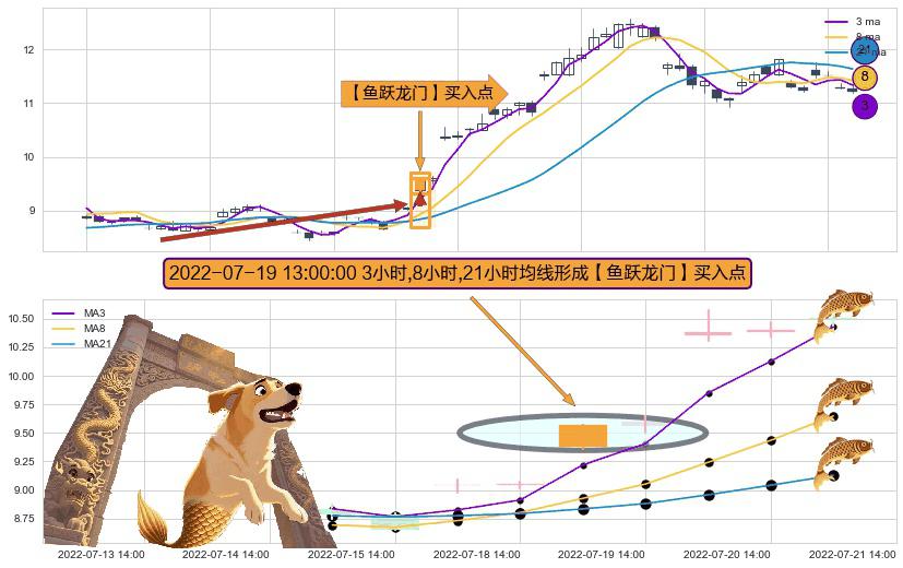 ⚀ 2022-07-19 13:00:00小时显现 3小时-8小时-21小时均线 【鱼跃龙门】买入点 看多信号,后市看涨,买入