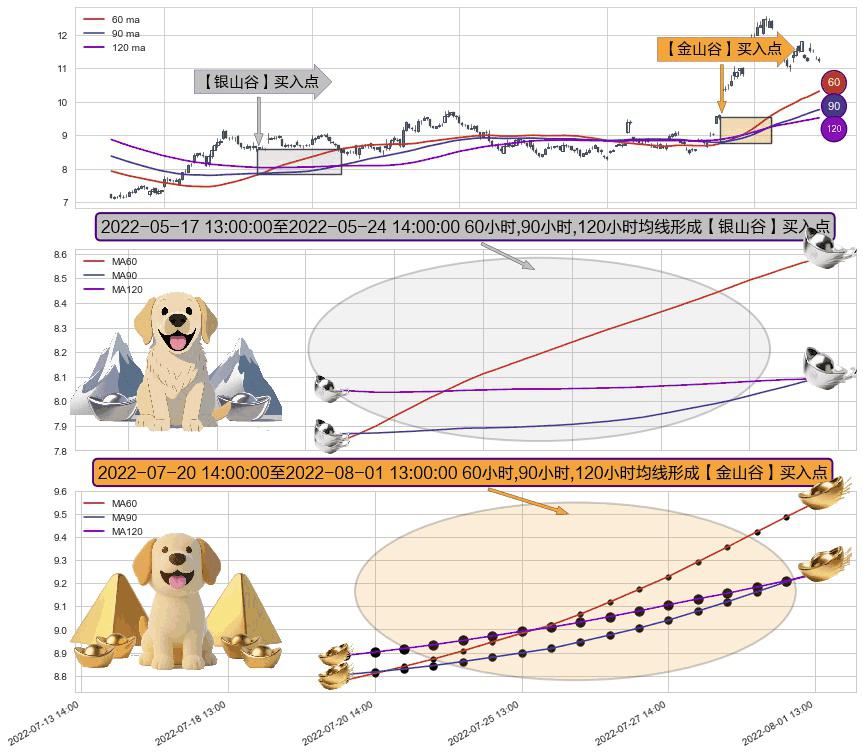 ⚃ 2022-07-21 13:00:00-小时至2022-08-01 13:00:00-小时显现 60小时-90小时-120小时均线 【金山谷】买入点 其再次确认了买入信号,可靠性更强,买入