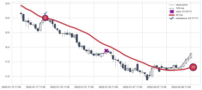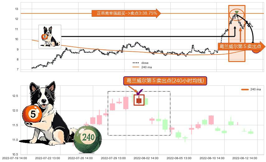 ⚀ 2022-08-01 13:00:00-小时显现 葛兰威尔均线 240小时均线 第⑤卖出点 上升趋势均值回复的短线回落信号,后市看跌,卖出信号