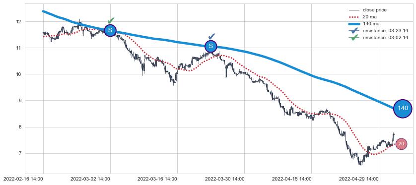 03-02 14:00至05-09 10:00 慢线与快线呈空头排列, 慢线与快线接触少,无缠绕