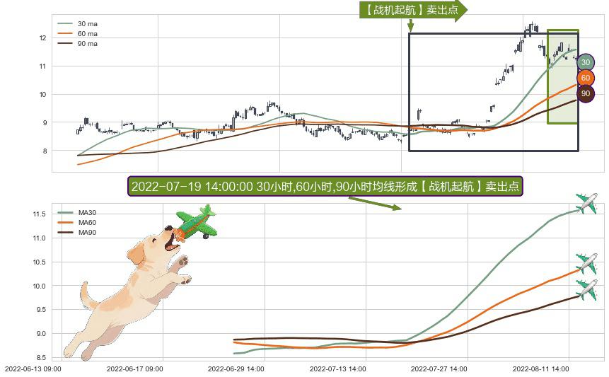 ⚀ 2022-06-24 14:00:00小时-2022-08-12 14:00:00小时显现 30小时-60小时-90小时均线 【战机起航】卖出点 看空信号,后市看跌,卖出