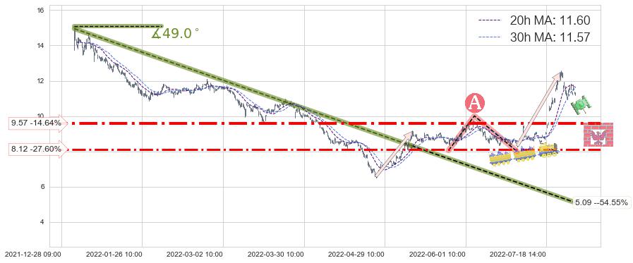♘ 支撑价格位9.57,可信任强度80.12%,距离最后交易2022-08-12 14:00形成的收盘价格11.21相差 -14.64%