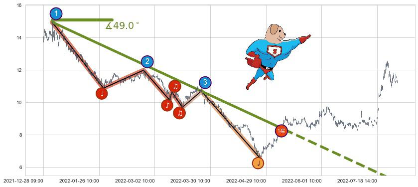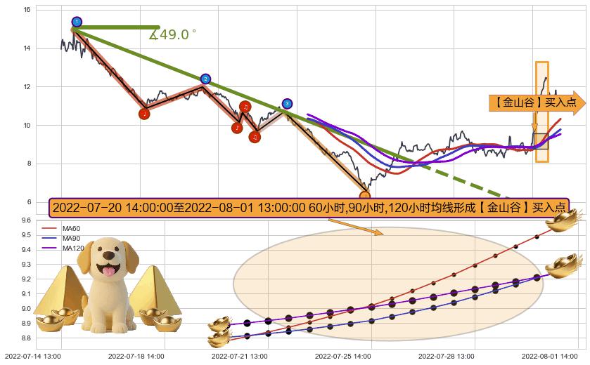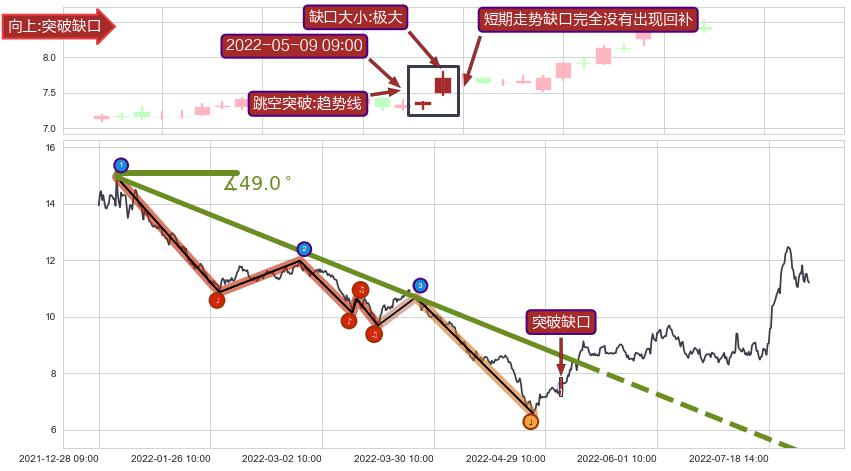 从2021-12-31 10:00至2022-05-12 14:00,共包含418个小时,阶段股价下跌-49.69%,阶段股价变动位移路程比: 1 : 7,下跌趋势角度: 49.0