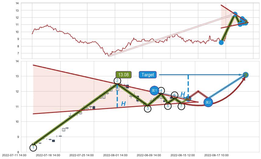 从2022-06-22 14:00至2022-08-12 14:00,共包含73个小时,阶段股价上涨32.12%,阶段股价变动位移路程比: 1 : 3