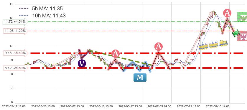 ♘ 阻力价格位11.72,可信任强度49.54%,距离最后交易2022-08-12 14:00形成的收盘价格11.21相差 +4.54%