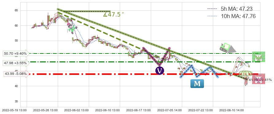 ♘ 阻力价格位47.98,可信任强度63.44%,距离最后交易2022-08-12 14:00形成的收盘价格46.34相差 +3.55%
