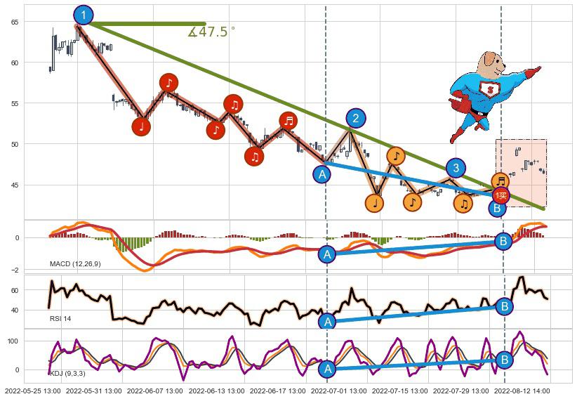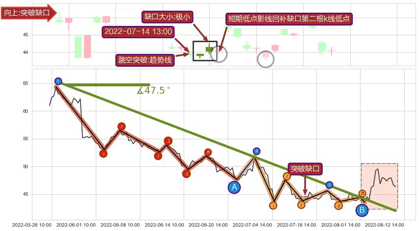从2022-05-26 13:00至2022-08-04 13:00,共包含144个小时,阶段股价下跌-30.75%,阶段股价变动位移路程比: 1 : 5,下跌趋势角度: 47.5,2022-05-31 09:00向↘︎形成缺口,跳空下跌-11.27%˚