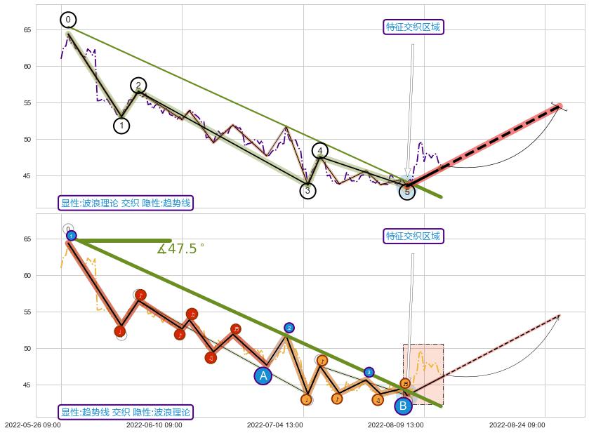 | 2 🅚:底部尽头线(上山虎) ➕ 🌊:波浪理论猜想下跌浪5已形成,猜想后续形成abc反弹上涨(均值回复) ☞ 看多信号 ⇥ 【🅚线】交织【图形】⇥ 综合量化分数: 55 | > |