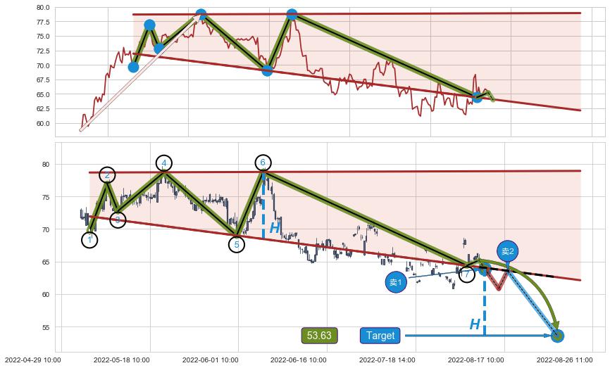 ➣ 【支撑】低点支撑位【③⑤⑦】一底低于一底,构成扩散三角的下斜边