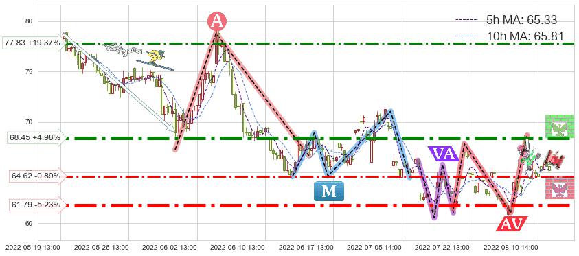 ♘ 阻力价格位68.45,可信任强度92.66%,距离最后交易2022-08-12 14:00形成的收盘价格65.20相差 +4.98%
