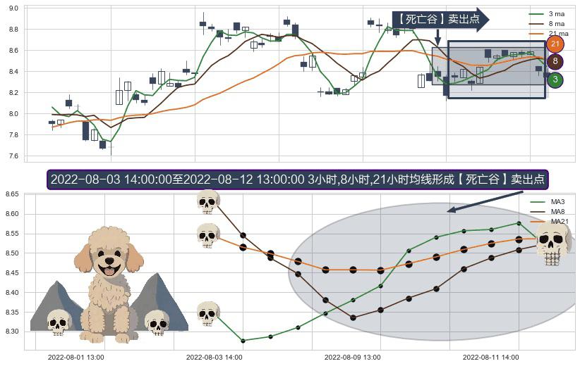 形态多维评估: ⚀ 2022-08-04 13:00:00-小时至2022-08-12 13:00:00-小时显现 3小时-8小时-21小时均线 【死亡谷】卖出点 看空信号,后市看跌,卖出