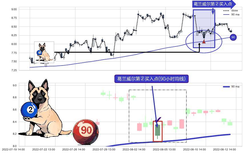 形态多维评估: ⚀ 2022-08-03 14:00:00-小时显现 葛兰威尔均线 90小时均线 第②买入点 上升趋势的中继信号,后市看涨,买进信号