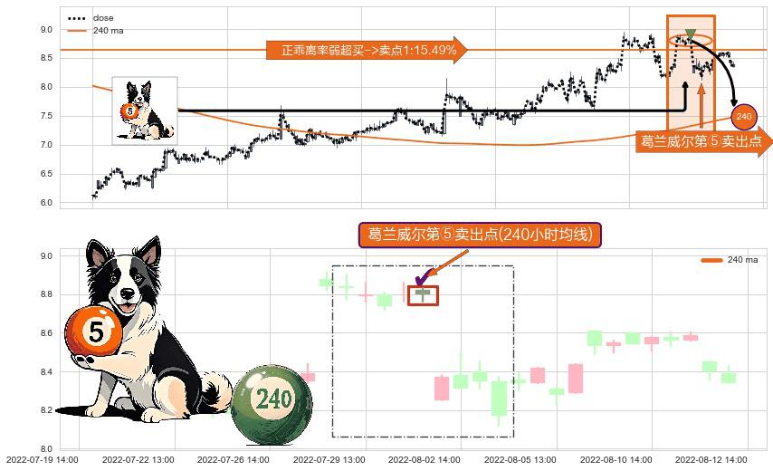 形态多维评估: ⚀ 2022-08-01 14:00:00-小时显现 葛兰威尔均线 240小时均线 第⑤卖出点 上升趋势均值回复的短线回落信号,后市看跌,卖出信号