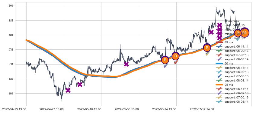 上涨趋势04-13 13:00-08-05 13:00,均线89, 90, 95确认关键支撑4处