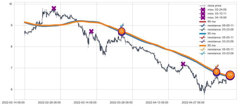 下跌趋势02-14 09:00-05-10 09:00,均线89, 90, 95确认关键阻力2处