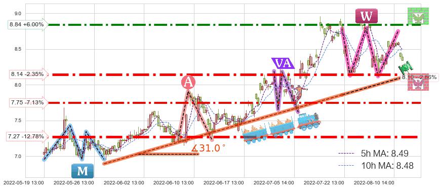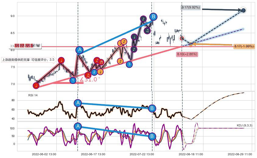 ♘ 支撑价格位8.14,可信任强度89.27%,距离最后交易2022-08-12 14:00形成的收盘价格8.34相差 -2.35%