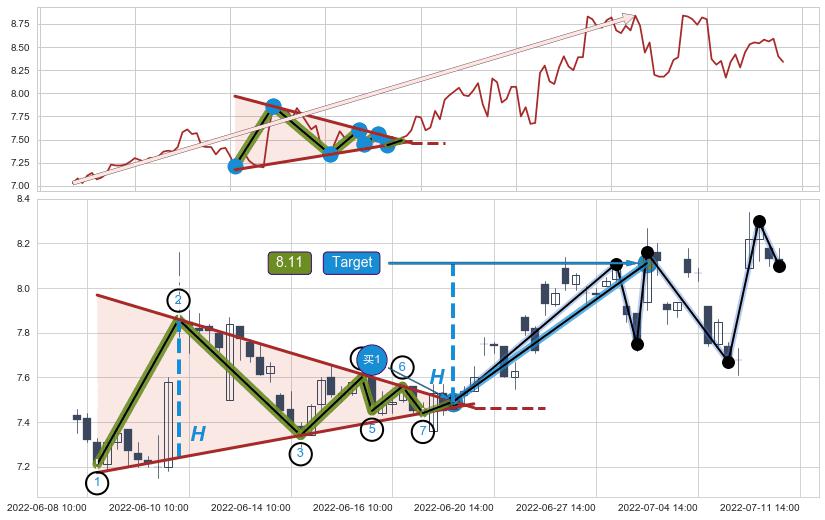 ➢ 最小中继整理涨幅→𝐇: 0.6200 (高点逐步降低斜边第一阻力点②与支撑边垂直距离)