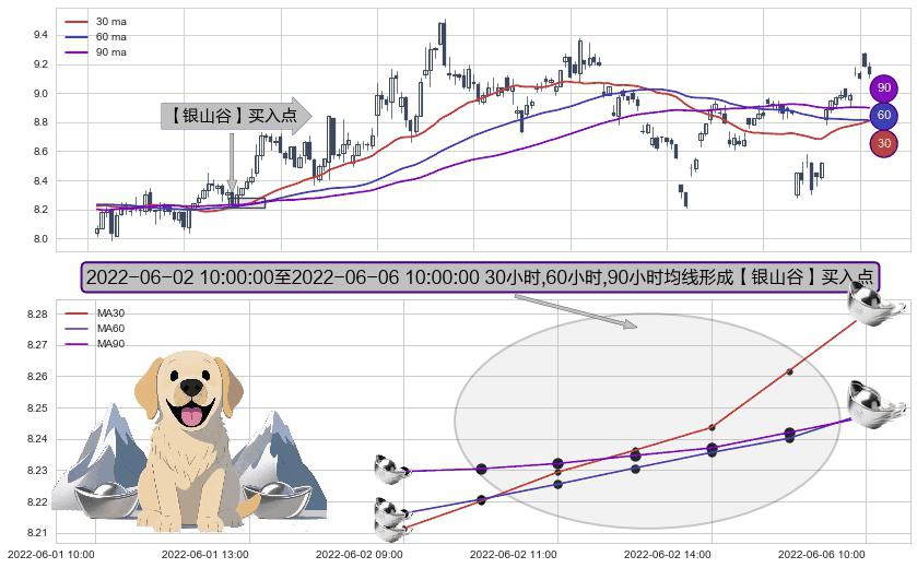 ⚀ 2022-06-02 11:00:00-小时至2022-06-06 10:00:00-小时显现 30小时-60小时-90小时均线 【银山谷】买入点 看多信号,后市看涨,买入