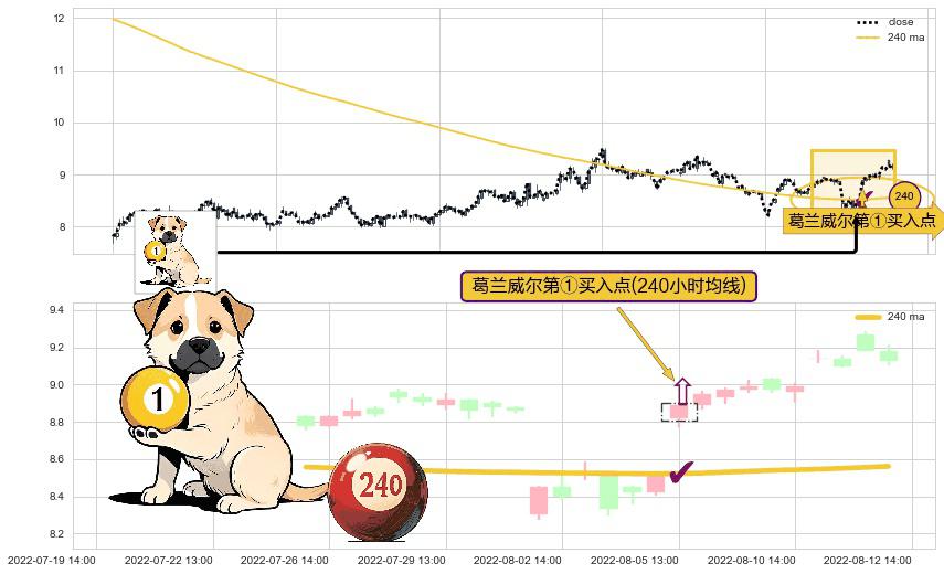 ⚀ 2022-08-05 13:00:00-小时显现 葛兰威尔均线 240小时均线 第买①入点 走势反转见底信号,后市看涨,买进信号