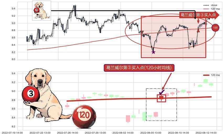 ⚀ 2022-08-05 13:00:00-小时显现 葛兰威尔均线 120小时均线 第③买入点 上升趋势的中继信号,后市看涨,买进信号