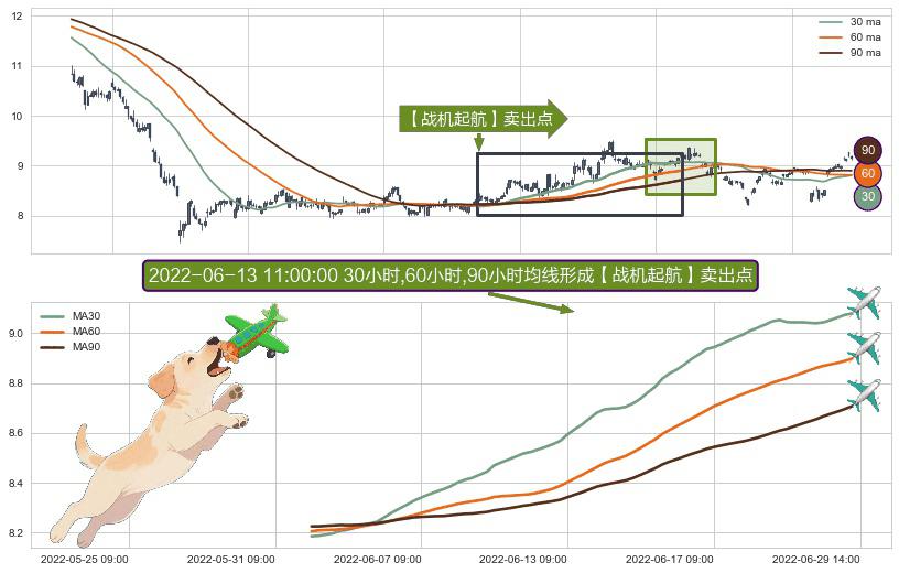 ⚀ 2022-06-01 09:00:00小时-2022-06-29 13:00:00小时显现 30小时-60小时-90小时均线 【战机起航】卖出点 看空信号,后市看跌,卖出