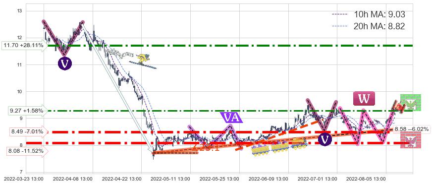 ♘ 支撑价格位8.08,可信任强度92.40%,距离最后交易2022-08-12 14:00形成的收盘价格9.13相差 -11.52%